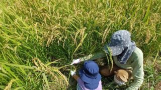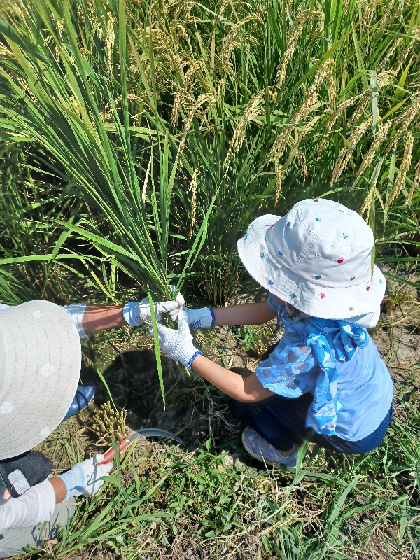 日陰のない暑い暑い田んぼで、軍手を着けて鎌の使い方を習って、一人ずつ丁寧に刈り方を教わります。